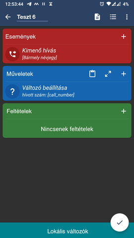 2. A hívás befejeztével aktiválódik a "Nem fogadott hívás" esemény (ha az 1. verziót szeretnékd tilts le vagy töröld ki ezt az eseményt) és küld egy SMS-t annak, akinek a nemzetközi hívószáma +36 20/30/70-et tartalmazza és még nem kapott üzenetet a Ne zavarj mód alatt.