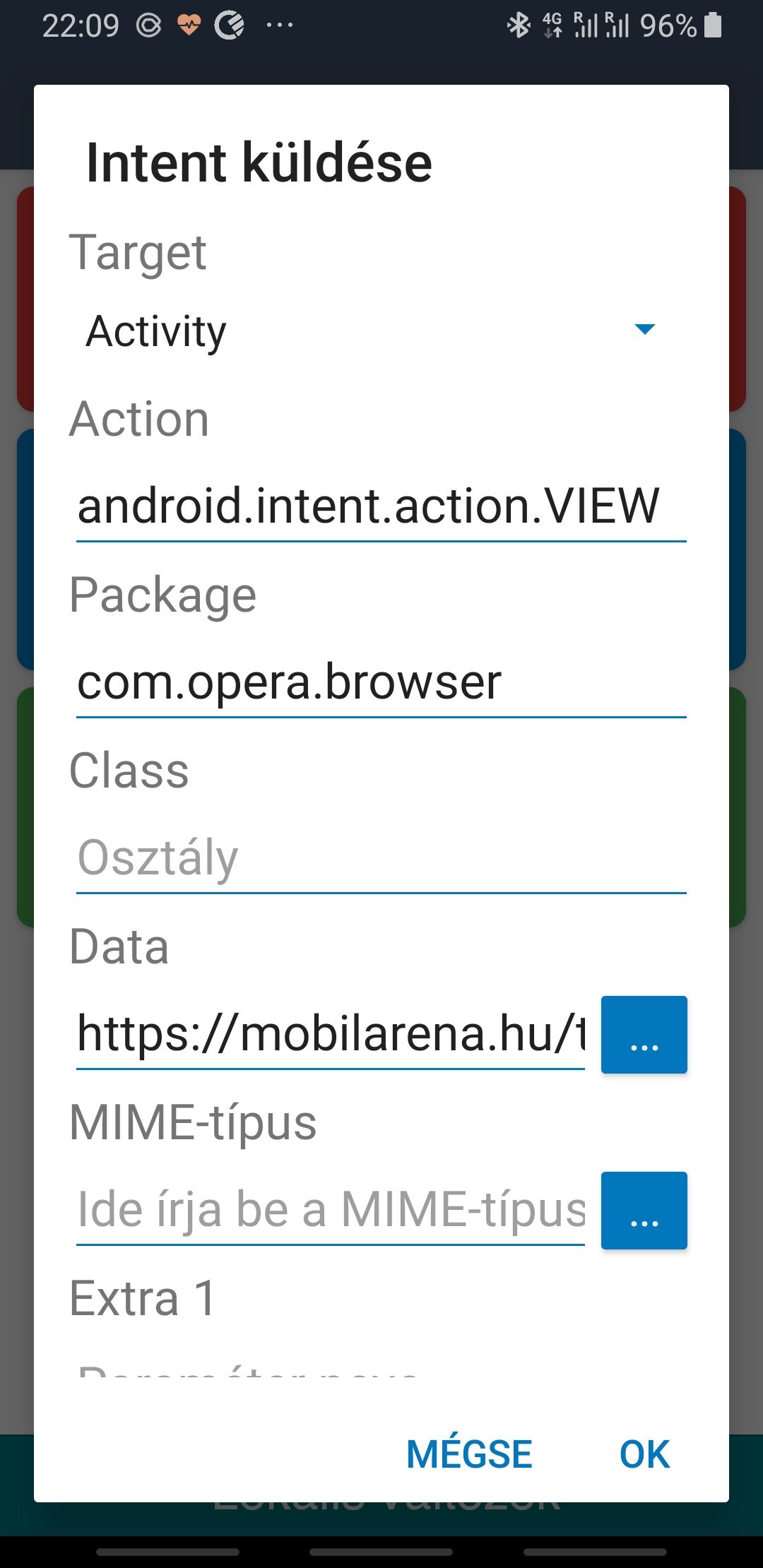 Megkeressük az indítani kívánt aktivity-t, majd hosszan nyomva a "Parancsikon szerkesztése"-t válasszuk. Ekkor megjelenik a Csomagnév és az Osztály. Ezek tartalmát kell átmásolni a MD intent küldés részébe.