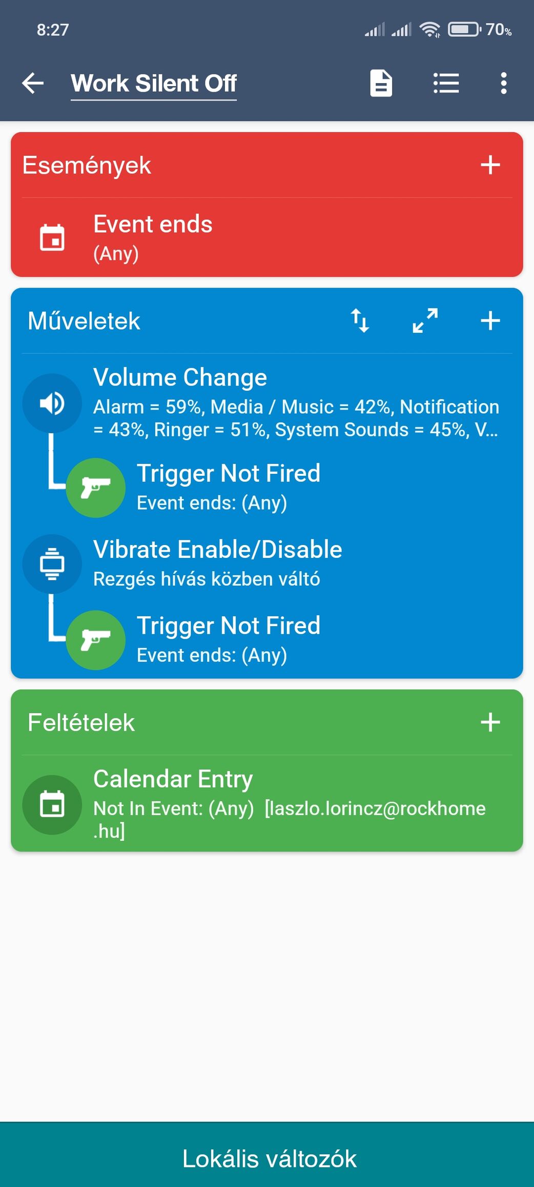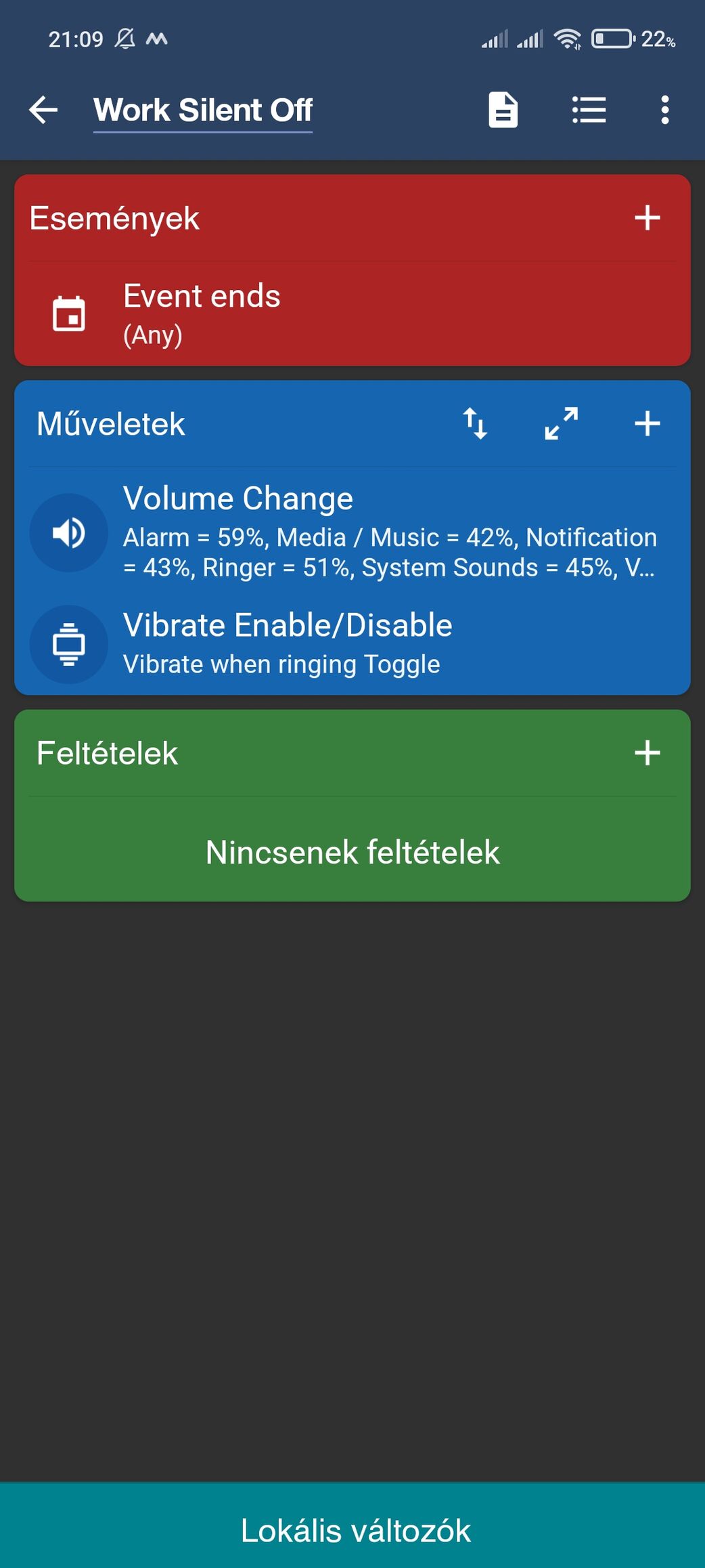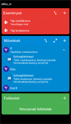 Engem az zavar a leginkább, hogy az eseményeknél többször volt már olyan, hogy megadtam egy feltételt hozzá, és nem működött, azóta ott soha nem adok meg feltételt, a műveletek között adom hozzá inkább. Nekem kézre áll a macrodroid nagyon, bár erobotban csak a felszín alá ereszkedtem anno éppen, te meg a fenéken kutakodtál. :)