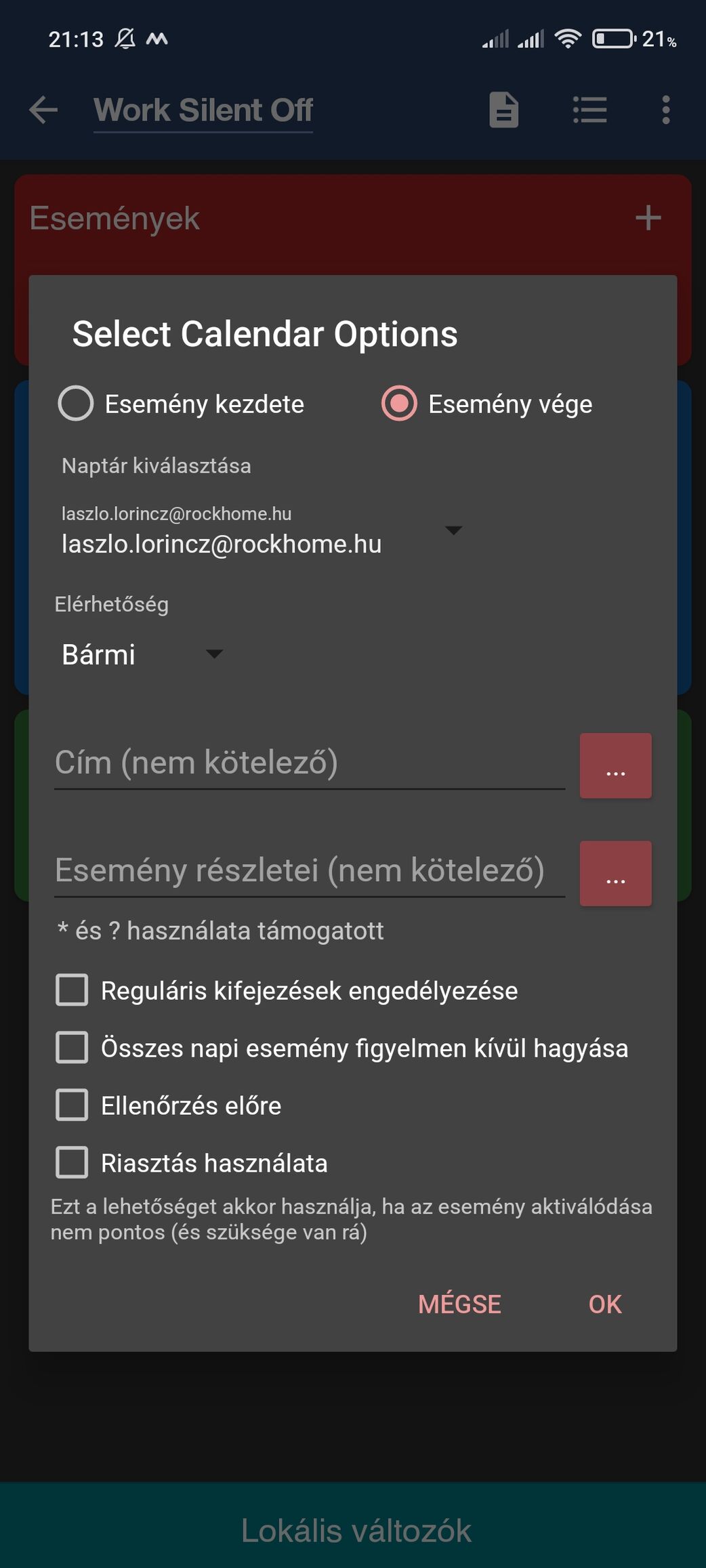 Tehát, hogy érthetőbb legyen. Ha pld van 3-4 eseményed és mindet a "Táp csatlakoztatva" vagy a "Képernyő be" feltételhez akarod kötni, akkor nem kell minden eseményhez egyesével hozzáfűzni, elég csak alul ebben az ablakban egyszer megadni. A műveletekre nincs hatással, azokhoz minden esetben külön kell feltételt csatolni, ha szükség van rá.