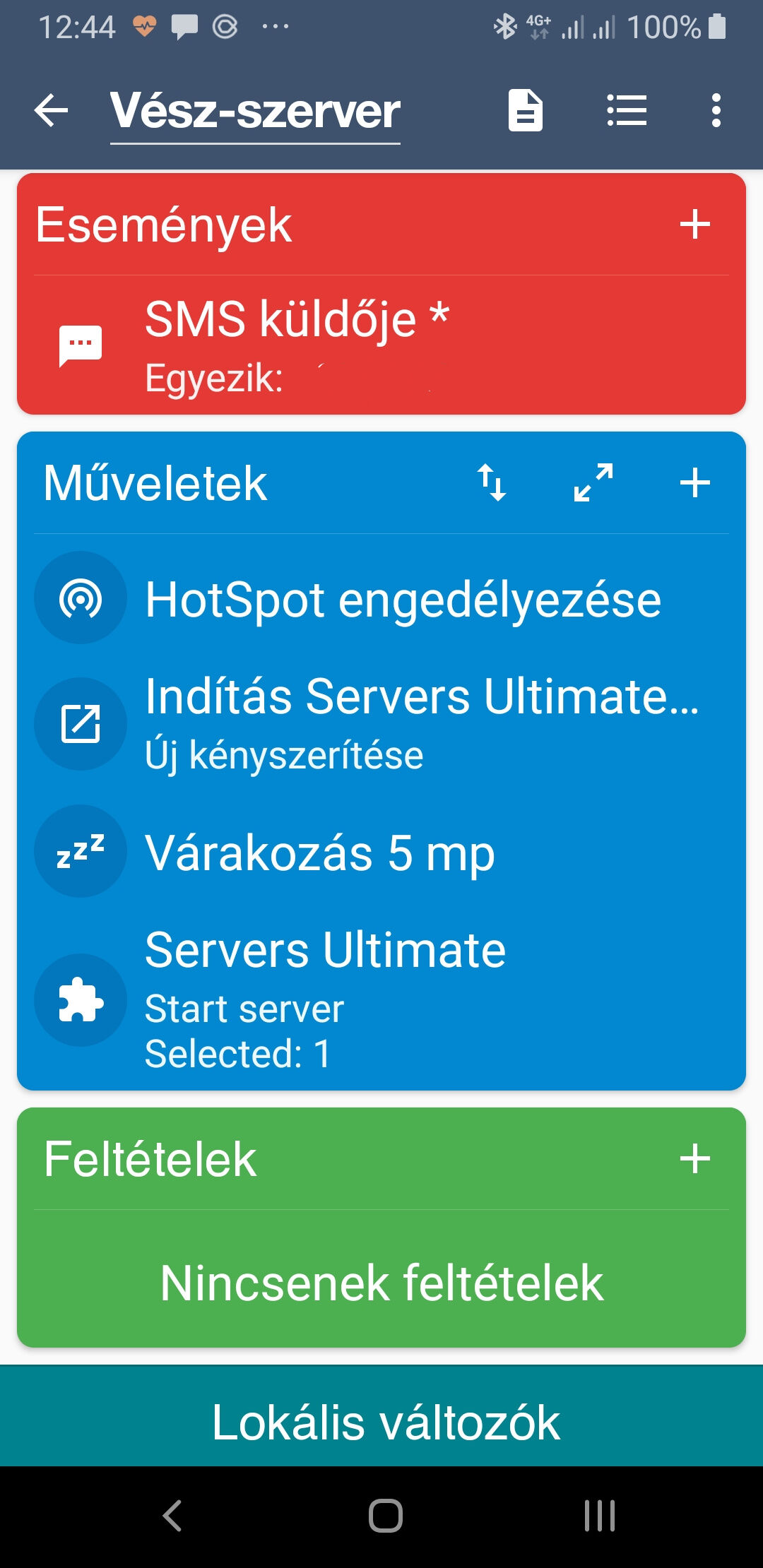 Na itt már gondoltam, hogy kell még egy esemény, mert feltételekkel ezt nem lehet szabályozni. Itt adtam hozzá a "Hívás folyamatban" eseményt és egy Logikai (igaz/hamis) változót, ami egy kapcsoló szerepet játszik és ezt feltételként használtam fel az SMS küldéséhez.