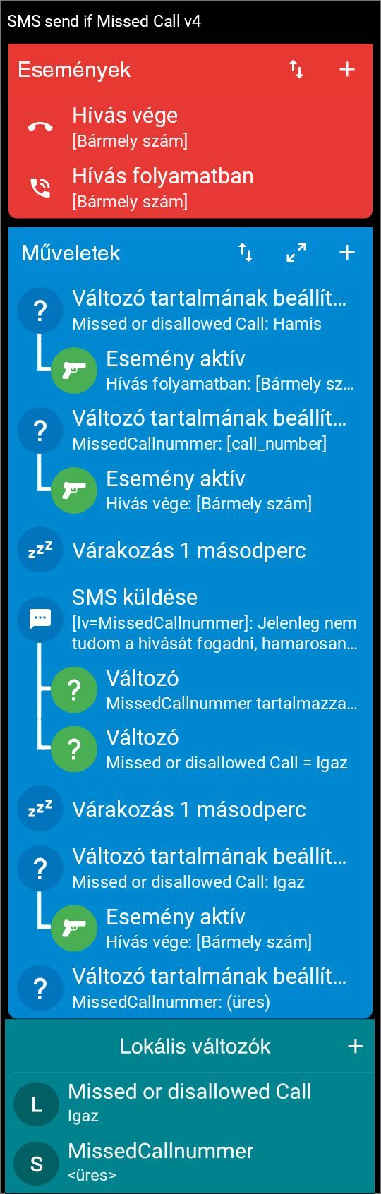 Amikor fogadjuk a hívást, akkor a "Hívás folyamatban" esemény hatására a változó - Hamis - értékű lesz, ezáltal az SMS nem kerül elküldésre. A hívás végén a változó ismét - Igaz állásba kerül és minden megy az elképzelés szerint.