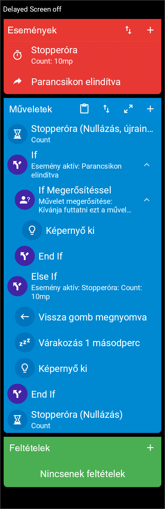 Egy kezemen meg tudnám számolni, hány olyan parancsot csináltam, aminél különböző eseményeket adtam meg, azonos feltétellel. Egy teló képernyőjén erre tök fölösleges ekkora felületet pazarolni. Ez sztem azért lett így, mert ahogy írod, kezdetekben nem tudott más feltételt. De, a fejlesztő is belátta, hogy a műveletekhez külön feltételek kellenek. Sztem az a zöld felület inkább zavaró, mint hasznos.