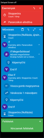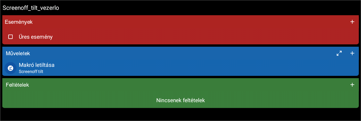 A képen levő makrót, ha legyártod és az Üres esemény-re egy tesztet indítasz, akkor addig fog 5mp-ként ismétlődni, a "Képernyő bekapcsolva" szöveg felolvasása, ameddig le nem kapcsol a kijelző. Ha ez megtörtént, akkor a "Képernyő kikapcsolva" szöveg lesz felolvasva 1x. -