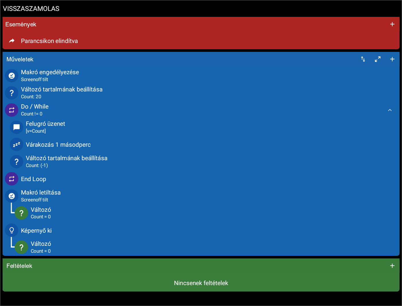 Sikerült megcsinálnom a visszaszámlálós kijelzést, kellett hozzá egy plusz makró. A meglévő képernyős makrót módosítottam. Nem kell így már a Stopper hozzá. Visszaszámlálás - Képernyő késleltetett kikapcsolás