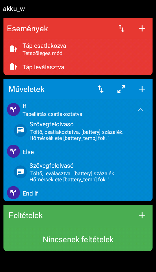 Annyit csinál, hogy ha az akku töltöttsége 20% alá esik és a telefon nincs töltőn, akkor bemondja, hogy "az akkumulátor töltöttsége alacsony". Ha pedig feltöltődött az akku 100%-ra és töltőn van a telefon, akkor bizonyos időközönként bemondja, hogy "akkumulátor feltöltve". Illetve ezekről az értesítési sávban is megjelenik infó (ez neked nyilván nem kell). Ha ezt át tudod alakítani magadnak, akkor feltöltöm magát a makrót is, ha kell.