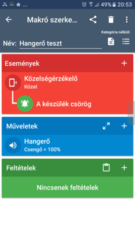Van egy wifi hálózat, amihez ha csatlakozik, akkor a hangerőket szeretném, ha beállítódnának különböző értékekre. Xiaomi Mi A1 stock 8.0+rootSajnos, ha kapcsolódik a hálózathoz, nem történik semmi, viszont, ha a programban rámegyek, hogy makró tesztelése, akkor végrehajtja a műveleteket.