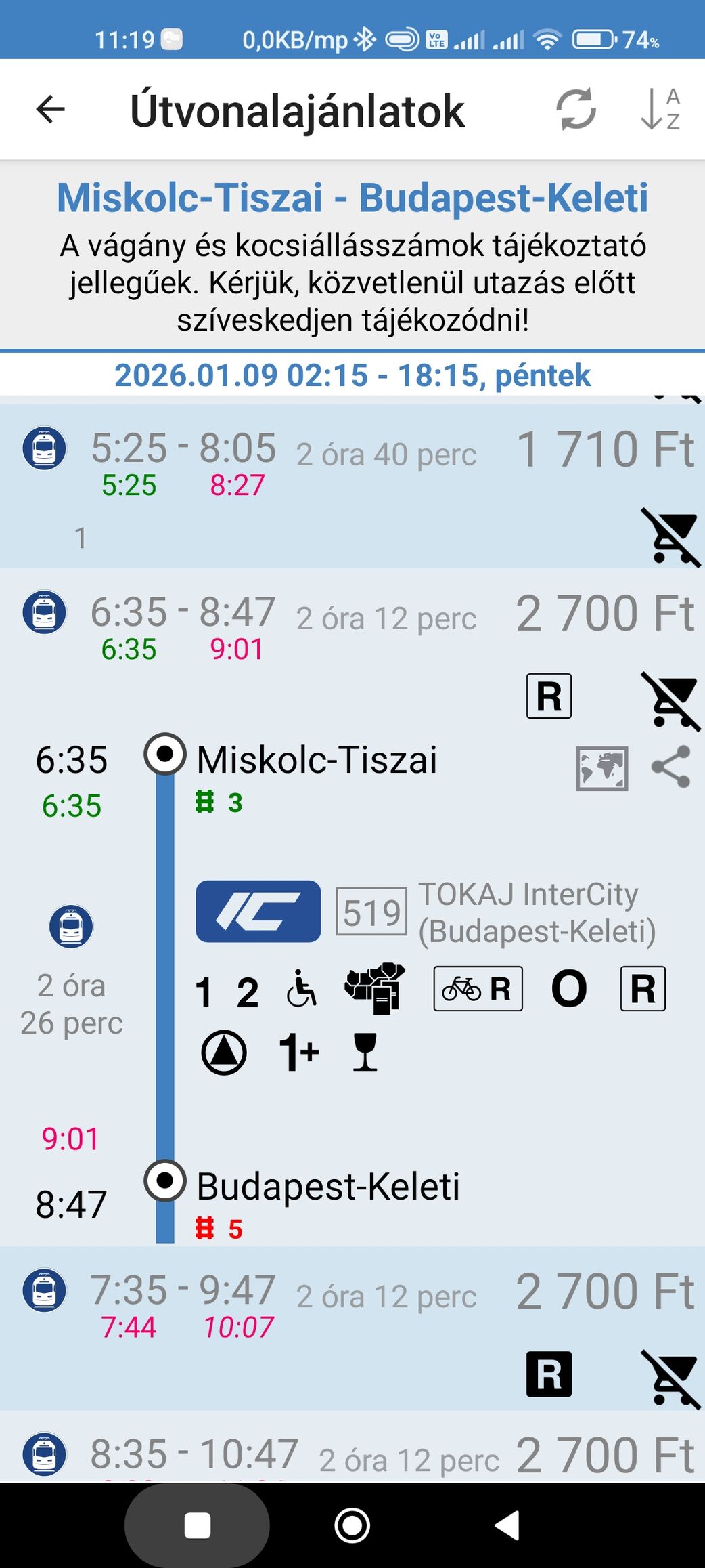 (miskolci tisztai pályaudvarról 6:35-kor induló 519-es Tokaj IC mikor érkezett meg a Budapest keleti pályaudvarra) -