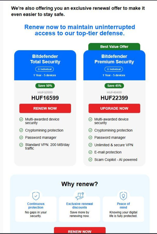Bitdefender most fog lejárni, meg kell várnom a végét, hogy újat vegyek akciósan? Tavaly ugyanezt vettem 5 eszközre (kikapcsoltam az auto renewalt), vagy másik mailre kell?