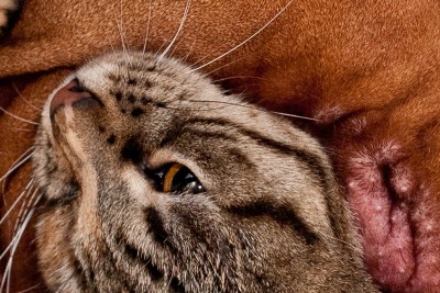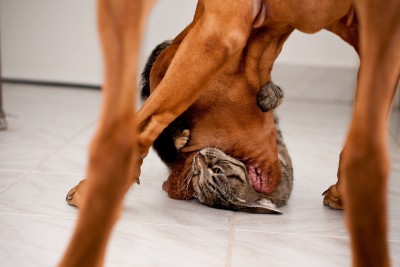 Szeretik egymást és meglepő módon mindig a cica megy oda a vizslánkhoz játszani. Ilyenkor sokszor Bé elkapja a cica torkát és hirtelen széles mozdulatokkal felmossa vele a padlót!