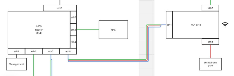 4. a hAP ax-en nincs vlan interfesz, csak a vlan tablaban tagelem a 99-et eth1-en (trunk), es untagelem eth4-en ahova a settopbox van kötve fixen