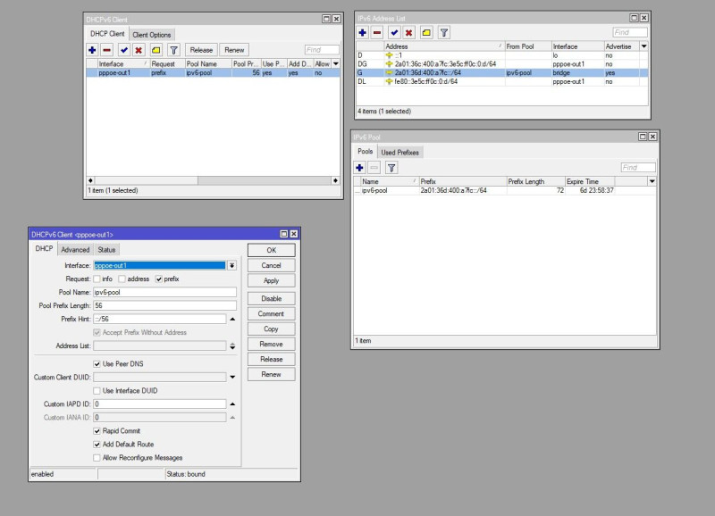 , tudom, ezzel megbotránkoztatom az itt jelenlévőket. Csak mondjuk akkor elég ha a router PPPoE lábának adsz egy ::1 címet az ipv6pool-ból. Az a pool1 ott mire van? -
