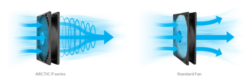 Mert megnéztem az tech sheet-et, ami hozzájuk tartozik. A saját ábrázolásuk szerint is széttartó légáramot fújnak a ventijeik, az Arctic nem. A Tranquil klasszikus irányban fújja a levegőt, tehát inkább oldalra, az Arctic meg inkább egyenesen, és egy keskeny házban az jobb.