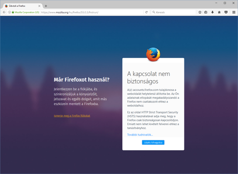 Ez az oldal HTTP Strict Transport Security (HSTS) használatával adja meg, hogy a Firefox csak biztonságosan kapcsolódjon. Emiatt nem lehet kivételt felvenni ehhez a tanúsítványhoz.