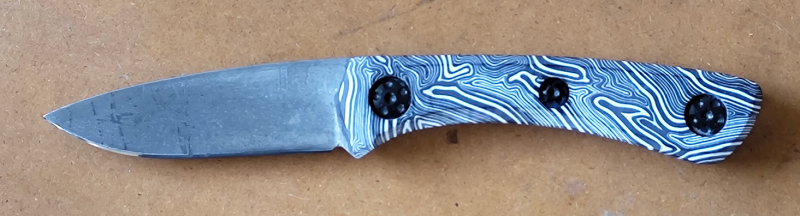 Csináltam egy vadászkést öcsémnek még múlt hónapban, ez K110 és zebra micarta. A pengén volt egy kis ragasztó maradék ami nem látszott és azzal együtt savaztam le