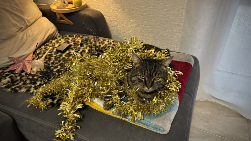 Nálunk is nagyon boldog volt a macsek karácsokor! A lányom őt is feldíszítette!