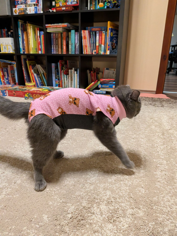 Kicseréltettem tegnap egyel nagyobbra, szerintem ez jó. Mondjuk mozogni ebben sem nagyon szeret, meg lépésnél furán remegve emeli a lábát, de hát gondolom nem valami komfortosak neki ezek a ruhák. Inkább amiatt aggódom kicsit, hogy tegnap kétszer hányt, ill. ma korán reggel is még. A kaja jött vissza neki. Azóta szerencsére minden OK. Van étvágya, eszik, iszik, pisil, kakil. Remélem csak az altató ill. a másnap (pénteken) kapott fájdalomcsillapító hatása.