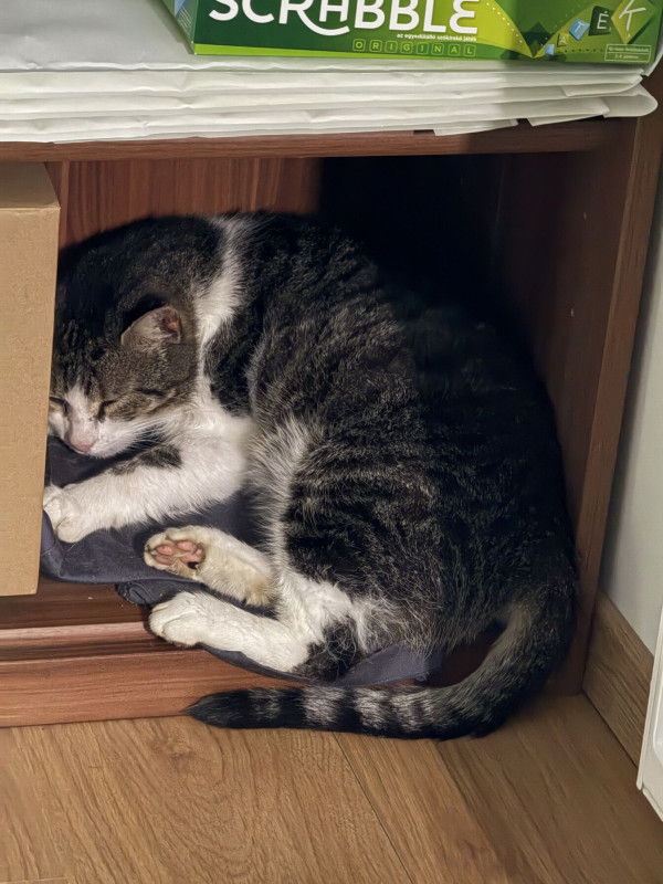 Lányom (13) osztálytársa nagyon szeretett volna cicát, de a szülők nem akarták. Múlt héten elmentek a Balatonra pihenni pár napot, és egy esti séta alkalmával hallották a veszett macskavisítást. Odamentek, és csak egy pici cicát találtak, majd láttak elskerázni egy rókát. Körbe néztek, de semmi más nem volt ott. A cicát becsempészték a szállodába, jobb híján adtak neki tejet és joghurtot, másnap hazajöttek. Felhívtak minket, hogy tudunk-e ajánlani menhelyet, amely befogadná a cicát. Aztán ez módosult, a cica maradhat, de csak kinti cicaként, szóval azért hívtak fel, hogy milyen megoldással lehet megakadályozni, hogy a cica levadássza a kertben a madarakat. Aztán ez is okafogyott lett, benti cica lesz.