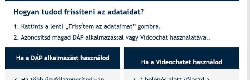 Megcsináltam online videochaten az adategyeztetést. Elsőre csend volt, szóval újraindítottam a hívást. Másodjára tárcsázós csipogás, majd ismét csend. Harmadjára már megjött a kép és a hang, egy kedves hölggyel pillanatok alatt lezajlott a folyamat és még egy ügyfélszintű kód beállítására is megkértem.