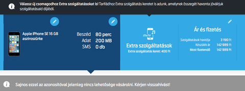 Hi! Olyan problémám lenne, hogy a telenor webshopban nem tudok venni készüléket. Belépek a mytelenorba készülék-bónusz, kiválasztom a telefont a tarifát az online fizetést, ki is írja hogy készülékcsere díj xxFt beleszámolja, a végösszeget alulra ki is írjaAz utolsó lapon ahol már félig kivannak töltve az adatok pl. név cím stb, már ott van a kiválasztott készülék is, de valamiért ide már nem teszi ki, nem számolja bele a készülékcsere díjat,csak a készülék árát.És gondolom ezmiatt nem enged vásárolni, "a kiválasztott termék az ön részére nem elérhető" piros felirat ugrik fel, ahogy a továbbra klikkelek.Mi lehet ez?