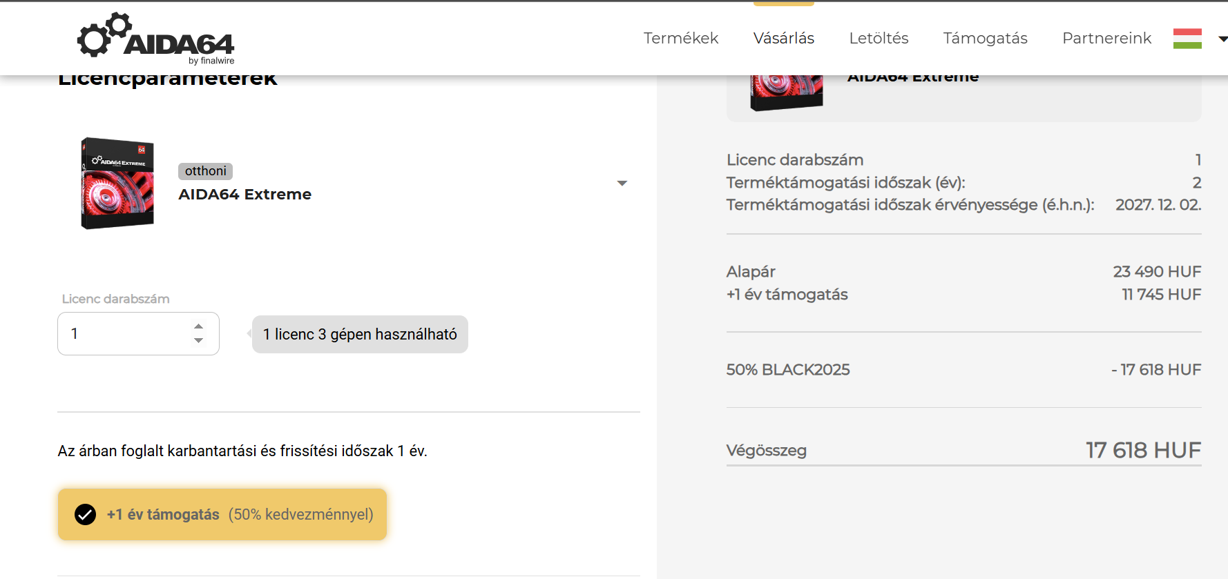 AIDA64 Extreme előfizetés 50% kedvezménnyel (1 licensz 3 gépre telepíthető):