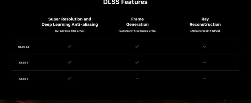 Az NVIDIA több marketing táblázatban a DLSS upscaling modulját (helytelenül) DLSS 2-nek írja, ami viszont már a 3.7.10-es verziónál jár, ami szintén minden RTX kártyán működik.Röviden: DLSS upscaler (Super Resolution néven szerepel a táblázatban) összes verziója (2.0-tól felfelé), a DLAA és ezzel együtt a Ray Reconstruction is minden RTX kártyán működik, ezt mondjuk a táblázat is jelzi.