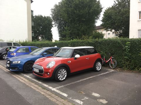 Katica anno, amikor először próbálta a Minit, az első gázadásnál összepisilte magát, amikor a lehúzott ablakon keresztül megtöltötte az autót az a mély brummogás, amit az tudott. Persze az még a négyhengeres 1,6-os volt, de azt el kell ismerni, hogy motorhangban nagyon ott vannak a bajorok. A három henger már egy kicsit kopog, de sikerült olyan jól leszigetelni magának a motornak a hangját, és cserébe a kipufogó felől egy, az előzőhöz hasonló mély brümmögést beleügyeskedni, hogy ha nem figyelsz, fel sem tűnik, hogy csalás az egész. Menni meg úgy megy, ahogy kell. Az előzőn 15-ös kerekek voltak, ezen 17-esek, ebben már van módválasztó sport, normál, és gazdaságos üzemmel, eleve mintha egy kicsit úgy lenne keményebb a futómű, hogy közben javult a csillapítás, ellenben a kerekek még mindig kint vannak a sarkokon, és a motorháztetőből még mindig csak a lámpák dombocskáit látod magad előtt, és az egész olyan érzés, hogy ha kitennéd a kezed, meg tudnád törölni a fényszórót. Jó, 100 kg-mal több lett maga az autó, cserébe van 10 extra lóerő, és bár feelinges volt, hogy el kellett az előzőt pörgetni 4000 körülre, hogy úgy igazán meginduljon, azért annak is megvan a varázsa, amikor már 2000 körül ott a teljes erő a lábad alatt. Elképesztő egyébként az áttételezése, ez az első autó, amit vezettem (pedig volt pár), amiben könyörtelenül vissza kell kapcsolgatni egyesbe, ha lelassul, és nem csak akkor, ha megállsz. 30-as táblánál 3-asban már fuldoklik, kettesben diszkrét 1500-2000 körüli fordulattal húz. Hatosban, 4000-nél valahol 180 körül van a mutató. Mezei közúton, ami itt 100-as, de szinte állandóan 80-ra van lassítva, gyakorlatilag kínzás akár ötösbe felkapcsolni. Szóval a váltással van munka bőven. A Mazdához képest borzasztóan fura, mert az meg már 50-nél kéri a hatost, cserébe 140-nél már 4000 fölött forog autópályán.