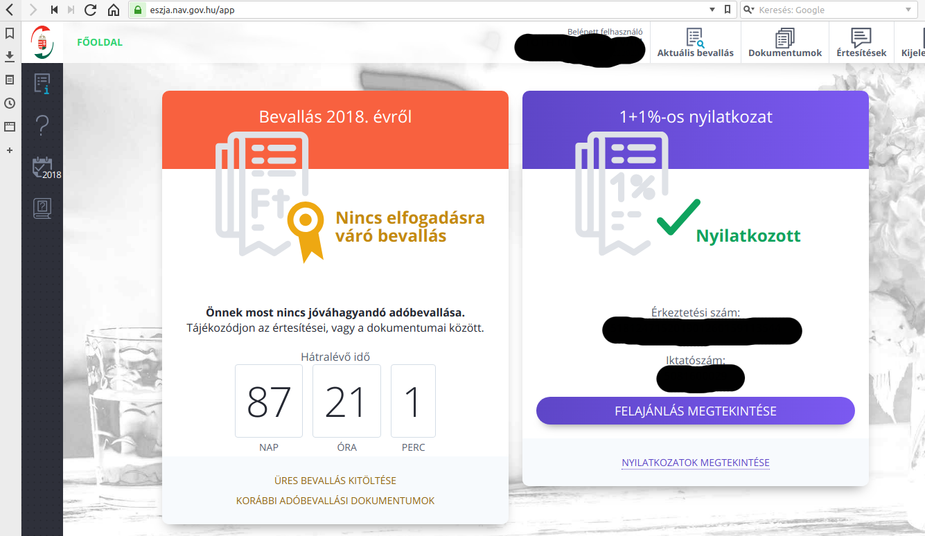 , igyekeztem kitörölni az adataimat és ehhez kb. Paint-szintű eszköz volt most az egyszerű megoldás, de mint látható, én már előre megtettem az 1+1%-os nyilatkozatokat.)Tegyük fel, hogy eljutottál addig, amit írtam is kb. az elején, hogy balra bizony van egy kalendáriumikon, amire kattintva tudsz adóévet váltani. (Ha ezt nem teszed, akkor bizony hiába próbálsz a 2018-as adóévre vonatkozóan korábbi adóbevallási dokumentumokat megtekinteni, hiszen nincsen mit.)