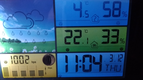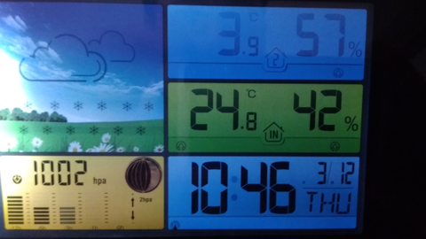 Jelen esetben akkor a 24,8°C 42% párával azt jelenti, hogy nagyjából (~23*0,42) 9,66g/m3 víz van benti levegőben. Ugyanekkor kint 3,9°C melletti 57% pára pedig (~5,7*0,57) kb. 3,25g/m3 nedvességet jelent.