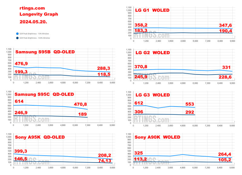 A "Milyen TV-t vegyek" topikban már megosztottam, de meg osztom itt is, ha valaki azt nem olvasná, készítettem egy összehasonlítást a WOLED (LG), és QD-OLED (Samsung) technológiák tartósságával kapcsolatban az "rtings.com" tesztjei alapján.