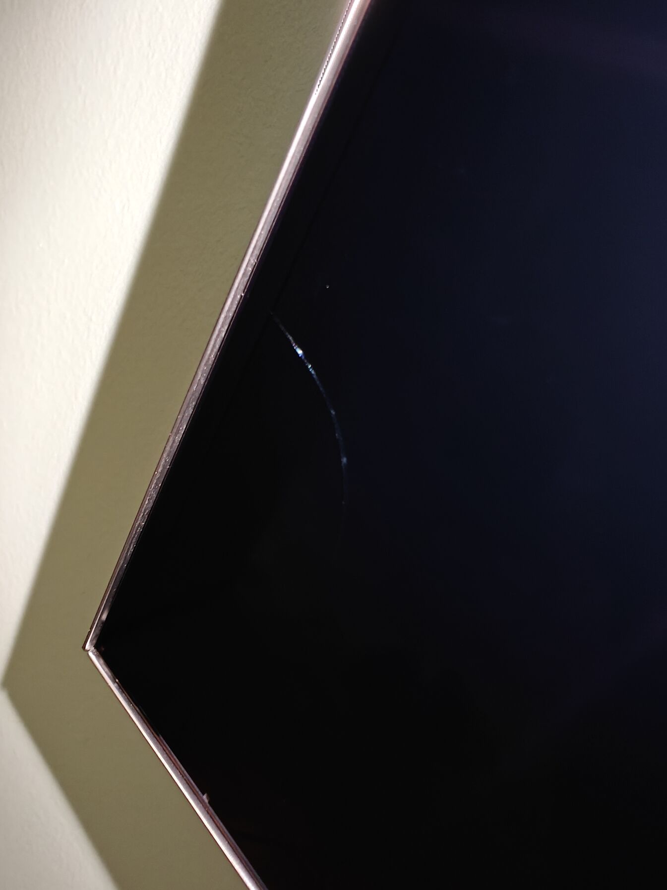 Azonban jött a hideg zuhany mikor leszedtük a fóliát akkor derült ki pontosabban látszódott, hogy egy kissebb kb 2 cm - repedés van a jobb alsó sarkában..