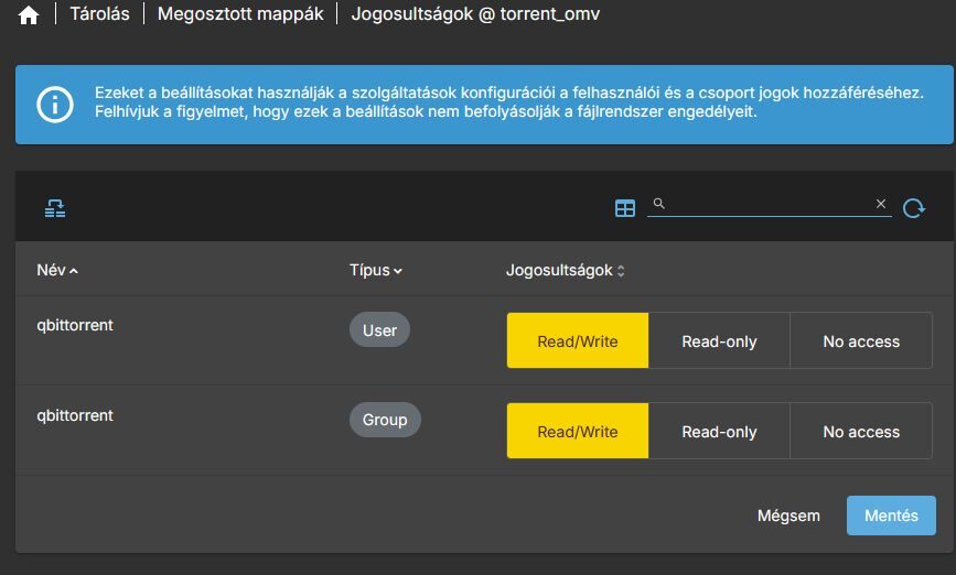Mi van nálad a Tárolás Megosztott mappák Jogosultságok @ torrent_omv alatt?