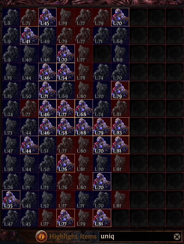Nagyon kevés a mati pedig az összes breach-et megcsinálom mindenhol. A currency-s womb-ot és mysterious-t, item level-től függetlenül, nyitogatom, a felszerelésesből nincs 83-as, a uniq-osból meg van egy rakat: