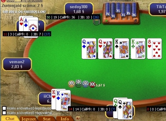 4 szék: fatality1112 (nagyvak) keze [Kc Ks] és veszített, lapja: full house, király hatos full