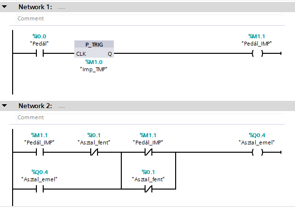 Egy pedál megnyomására (bemenet) egy asztal felemelkedik (pl Q0.4 kimenet), majd újboli megnyomásra asztal lemegy. Ahogy az asztal felemelkedett, bejön a végállása, azaz asztal fenn. Pedál újboli megnyomására asztal lemegy. Nekem ott a gondom, hogy ha megnyomom a pedált, de nyomva tartom, akkor ahogy bejön az asztal fenn állapot, azonnal vissza le is megy, mivel figyelem az asztal fenn állapotot.