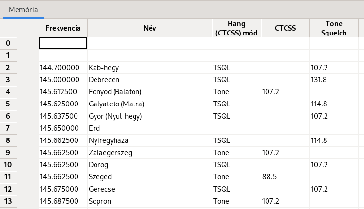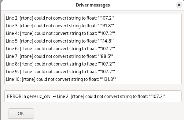 Ekkor már nem próbálja dátummá alakítani.Mind1, a lényeg, hogy a chirp nem problémázik. (Szerintem idióták írták az import modult. Ha nincs CTCSS, nem elég ,,,-vel érték nélkül továbblépni az oszlopokon, ehelyett kamu CTCSS frekvenciákkal kell megtölteni, mert a beolvasott értéket nem vizsgálja, egyből lebegőpontosként értelmezi. Így amikor nincs CTCSS, üres értéket kap, hibára fut. Így nem lehet egyik frekvencia érték sem üres (,,88.5,88.5)