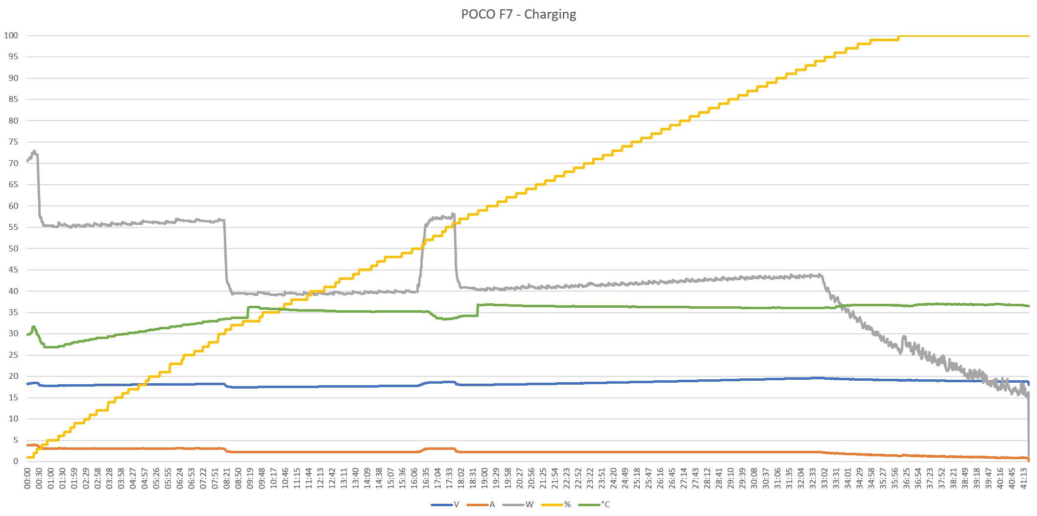 0-100% 47 perc.A mérésem nem releváns, mert 30-35%-nál a kezdeti 50W visszaesett 33-ra, mert túlforrósodott a töltő!!! Gyári!