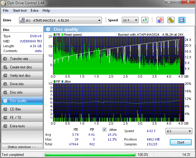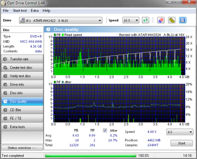 16x írás, 11000 PIE, 200 PIF, és 8.2% avg Jitter. Ráadásul első firmware-el. Ne tévesszen meg, a DQ tesztet 422es íróval végezte Dee.