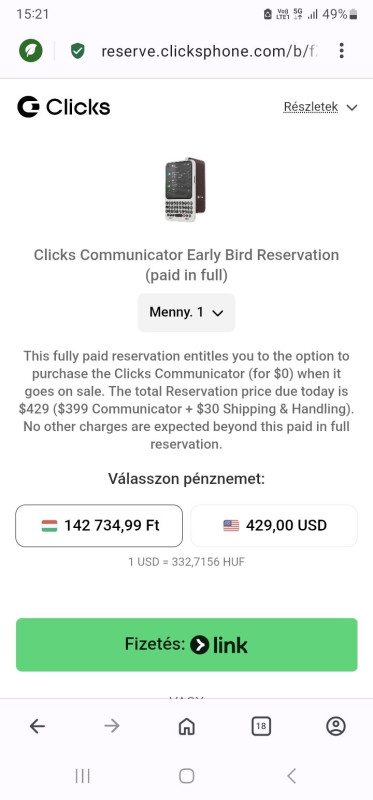 Gond ott van,hogy rámentem a fizetésre a clicks oldalon és felhozott 330ft árfolyamot fizetésnél és így 141eFt-ra jönne ki a 429usd.Ez nem tetszik annyira.😂Nem mindegy mennyi lesz az áfa.Igazán nem annyira vészes a különbség.Durván számolva 175eFt helyett 180eFt.Kérdés,hogy az otp még mennyit számolna rá a fizetéskor.