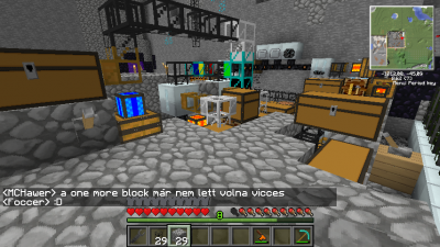 A poén az egészben az, hogy mindezt sikerült egy 3x3 blokk alapterületű és 4 blokk magas területre bezsúfolnom. Ezen kívül csak a tároló ládák lógnak. 2 Extractor 3 láda, 3 motor, 2 dia cső, 3 facső, 1 redstone, 1 leveler, néhány sima cső.