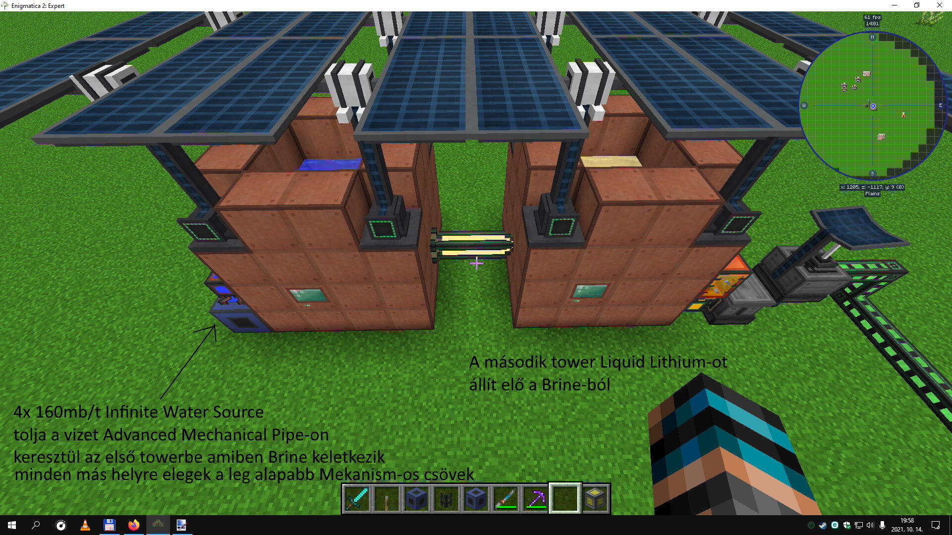 Persze lehetett volna nagyobbra építeni, de ahogy írtam ez ilyen minimalista setup, ami így még biztosan kiszolgálja alapjáraton a reaktort, 6-os injection rate-el, ez is 240K RF/t -t termel. Jelenleg a gáz generátorom kb. 6K RF-et ad ha maxon pörög, még ez sincs teljesen kihasználva és még majd most fogom kiépíteni a különböző automata farmokat TE-s gépekkel, de nem hiszem hogy az a 240K end game-ig kevés lesz, ráadásul biztos hogy minimum a dupláját is tudja ha kell