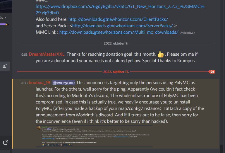 Nem tudom ki használt eddig rajtam kívül PolyMC launchert, fent vagyok a Gregtech New Horizons discord szerverén, és a felhívások részre bedobták ezt a postot:
