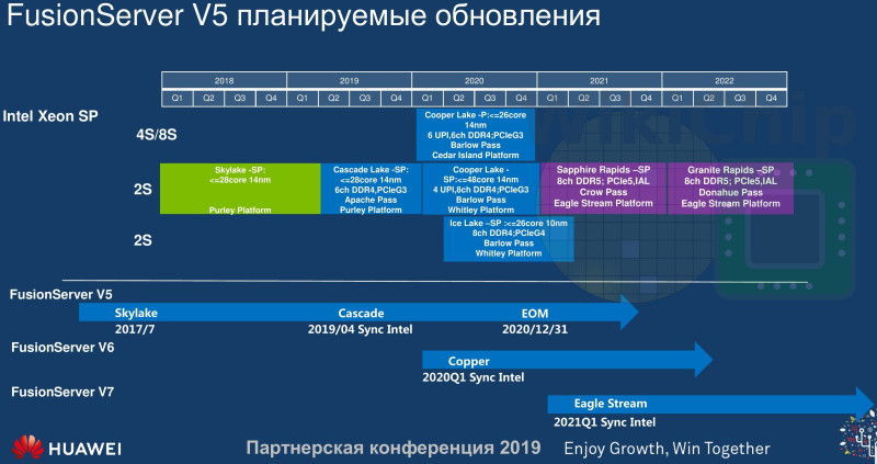 Itt a Huawei útiterve. Ezen jól jelölve vannak, hogy mi minek az utódja. A Cascade Lake-AP azért nincs benne, mert a Huawei sosem épített rá. De a Cooper Lake-P-re építenek. A Cooper Lake-SP tűnt el, az a Cascade Lake-SP vonal folytatása volt.