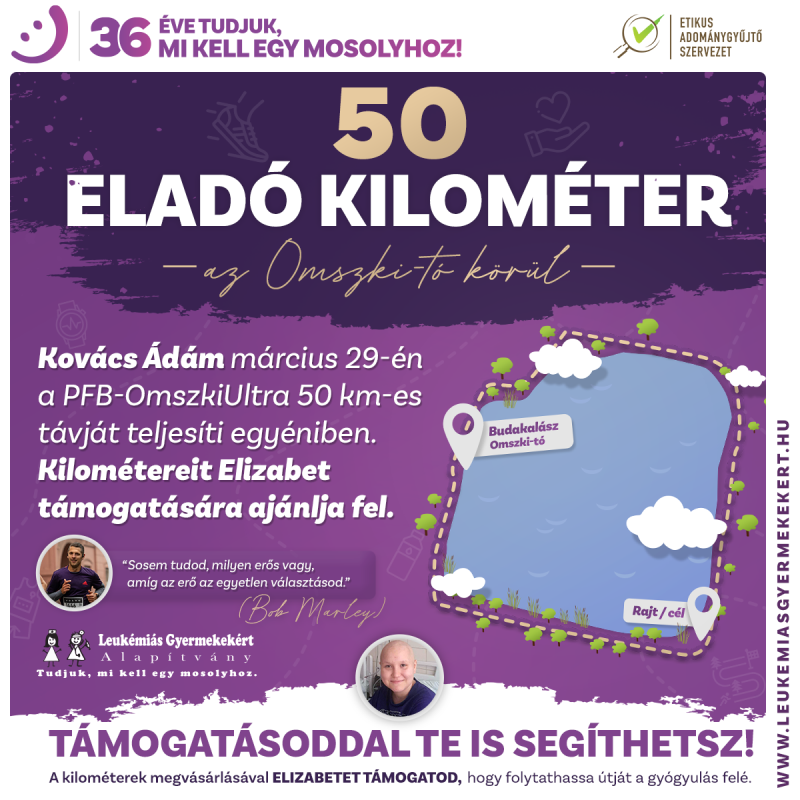 Egy különleges kihívásra vállalkoztam! Március 29-én 29 kört fogok futni az Omszki-tó körül, ez kerek 50 kilométer. Ennek keretein belül minden kilométert "eladok", amivel a 14 éves, leukémiás Elizabet gyógykezelését lehet támogatni a Leukémiás Gyermekekért Alapítványon keresztül. Hatalmas eredmény, hogy a komment írására már 205 kilométert "eladtam", ezzel pedig már 615 ezer forint támogatás jött össze Elizabet megsegítésére. A kampány nem áll meg vasárnap a célvonalnál, március végéig lehetőség van hozzájárulni. 1 km 3000 forint, amit az alapítvány oldalán kártyával, átutalással lehet rendezni. Hatalmas segítség lenne Elizabetnek és a családjának, ha még 128 km-t eladnék a hátralévő napokban.