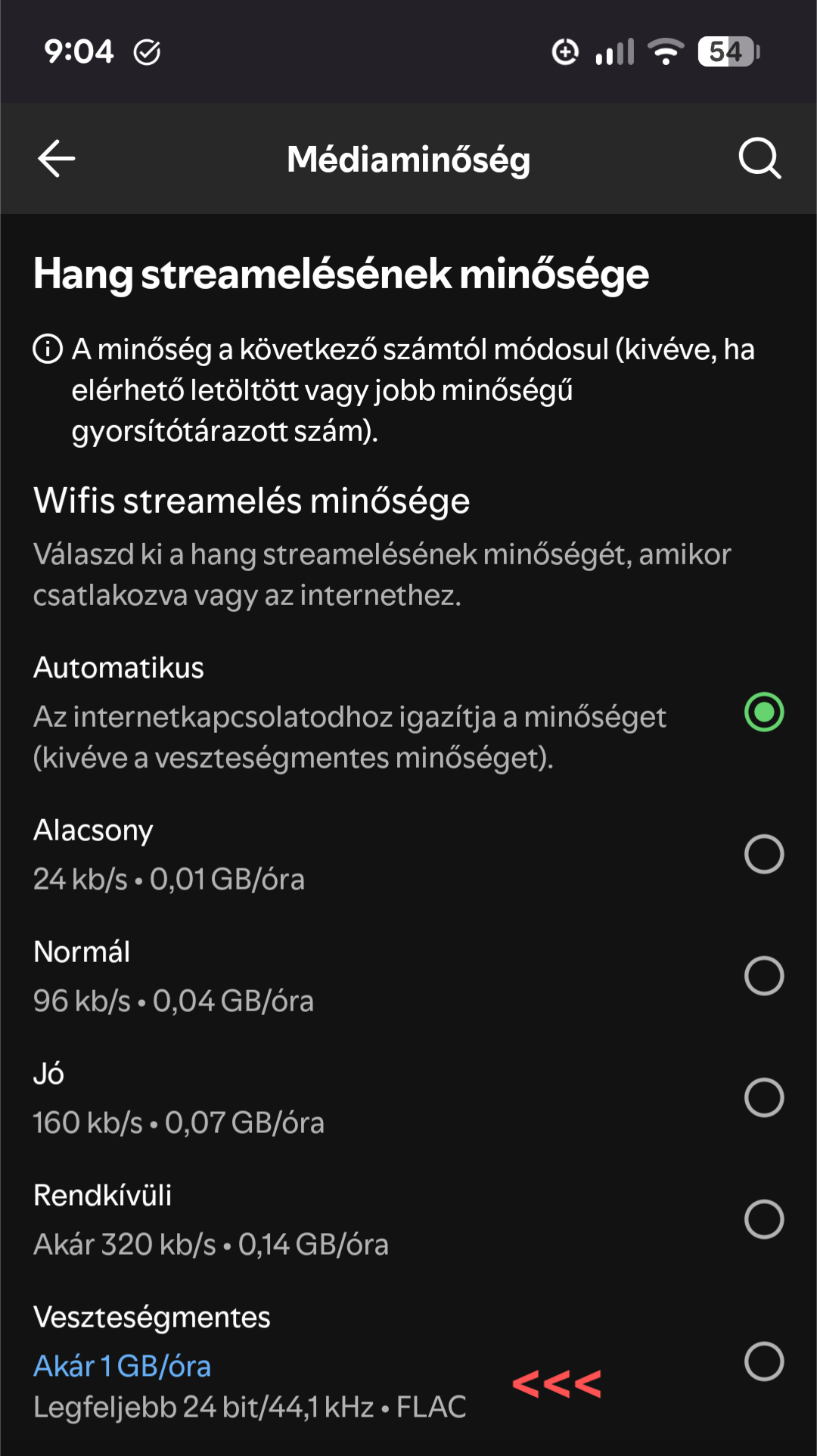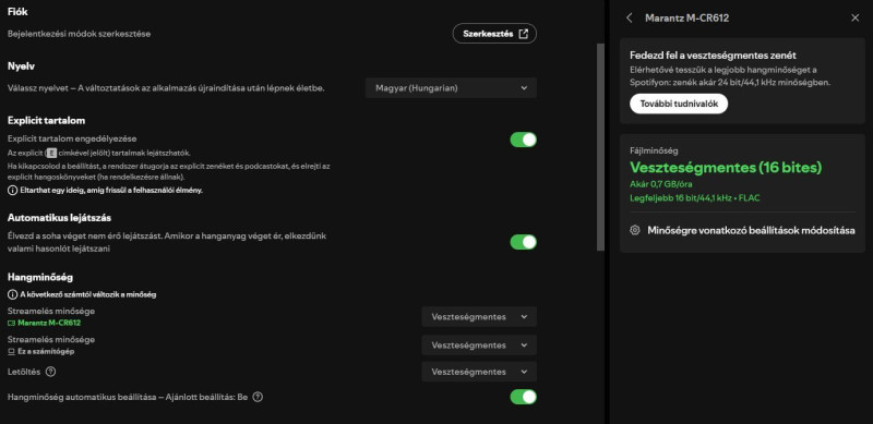 Ma estére nekem is megjelent a veszteségmentes lejátszás, de csalódott vagyok. Asztali pc-n, telefonon megy az átállítás, de a Marantz MCR612 hálózati lejátszón nem engedi az átállítást, azt mondja, az eszköz nem tudja ezt a formátumot.