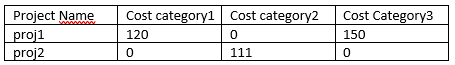 Hogy tudok ebből egy olyan lekérdezést készíteni, ahol a project neve mellett felsorolásra kerülnek (külön oszlopokban) a kategóriánkénti költségek.