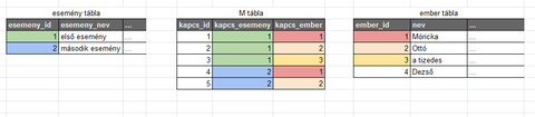 Nekem nem úgy tűnik, pl. hova írom be az eseményekhez a résztvevőket? Az ESET táblába nem tudom betenni, mert onnan az ID-vel kell kapcsolódnom a M táblához, akkor az M táblába kell felvennem egy résztvevők rubrikát?