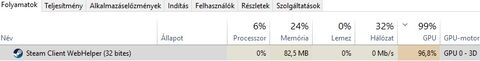 Két napja szívok ezzel a r*tkes "Steam Client WebHelper" dologgal. Negyed óra játék után beragad és 100%-n zabálja a GPU-t. Ha kilépek mindenből, akkor is ott marad és használja a kártyát. Csak a reset segít. Már azon voltam hogy valami hülye app zavarhat be talán, ezért újrahúztam a rendszert, teljesen szúz win 10: Steam-t felrakom, játék elindít, majd kb negyed óra után ismét elkezd akadni a játék. Feladatkezelőben pedig ott zabálja a GPU-t ez: