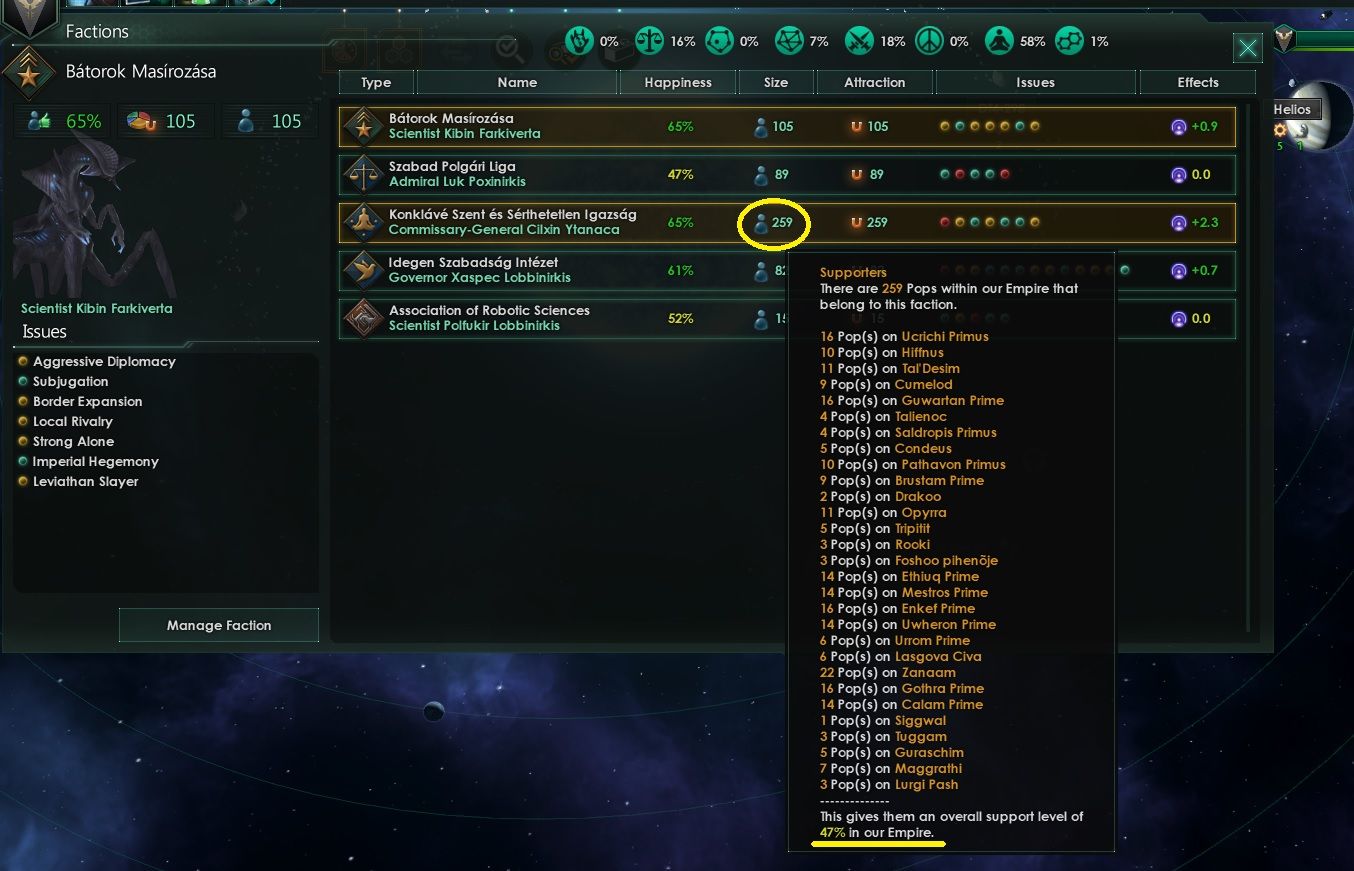 Persze ha a kormányzó pártok/frakciók aránya engedi az is lazán megtörténik néha, hogy elég pl az Authoritarianusokat suppresszálnod ha elég sokan vannak (a militaristákon kívül, egyéb frakciókhoz képest) elég sok Popot tudnak veszteni ahhoz, hogy már meg tudod tolni a Spiritualistákon az Embracet de ők is bentmaradnak a kormányban.Aztán érdemes még a folyamat elején, az első aktuális választás alkalmával a Spiritualisták frakciójából vezért választani, aki legfelülről tolja majd az egy és egyetlen Imperial Humanok atyaúristenének hitét a fejekbe..