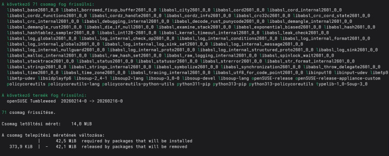 libSPIRV-Tools-2025_4 libutf8_range-32_1_0 opensuse-welcome-lang typelib-1_0-JavaScriptCore-6_0 typelib-1_0-WebKit-6_0A következő 14 csomag ELTÁVOLÍTÁSA fog megtörténni: